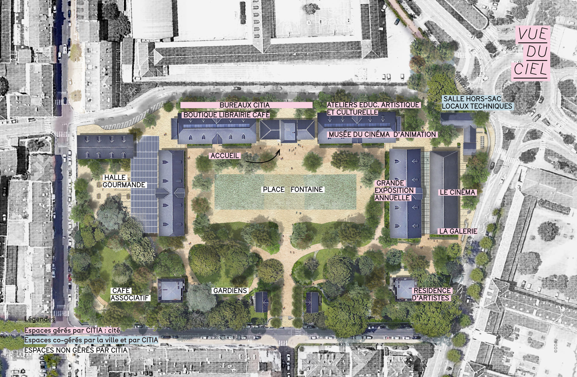 Au cœur d’un magnifique parc paysager de 2,6 hectares, la Cité internationale du cinéma d’animation sera installée aux côtés d’une Halle gourmande Biltoki et d’un café associatif.